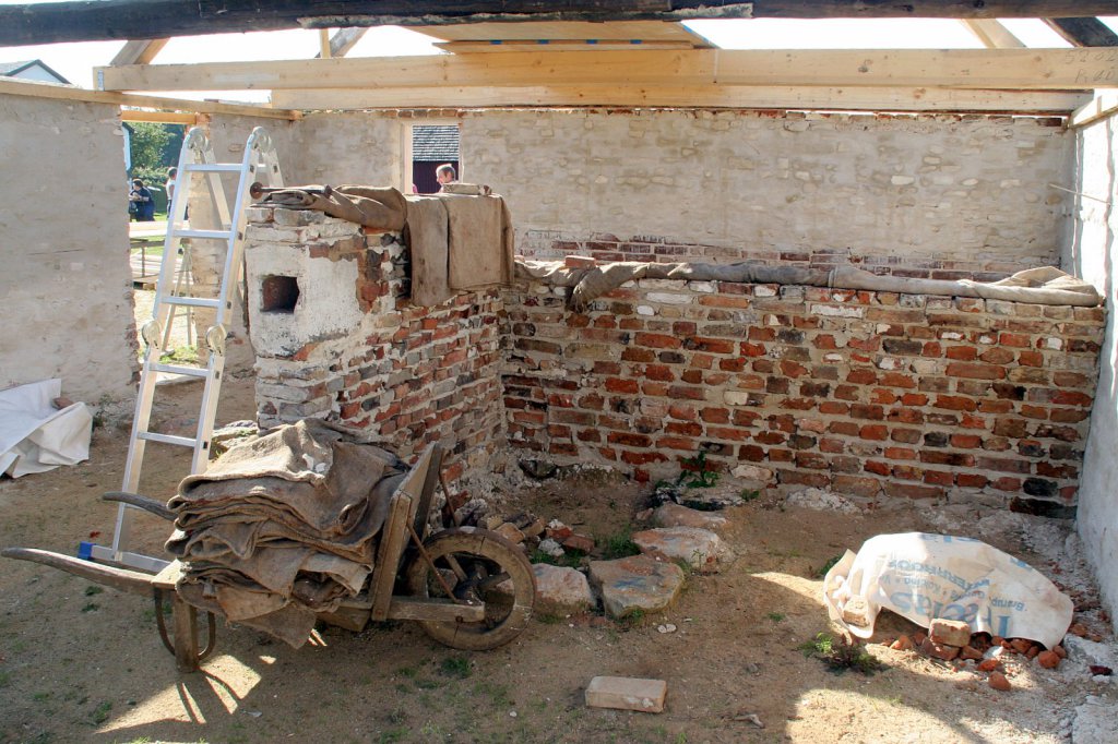 Dette er nu løst, så det nu er muligt at fyre op i bageovnen om natten og så fyre op i smede-essen om dagen, hvor der finder diverse aktiviteter sted. De sidste afpudsninger er næsten færdige, men vi kan allerede nu konstatere, at det virker.